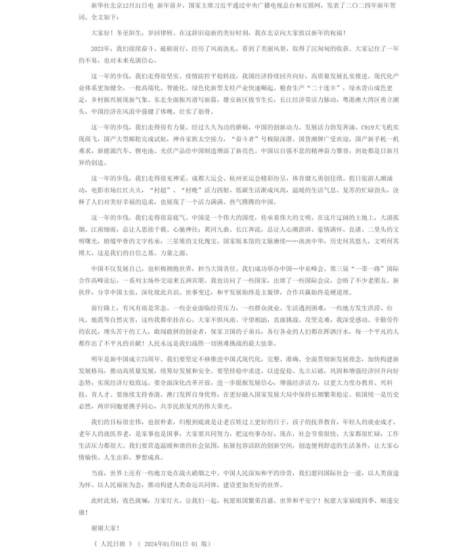 新华社北京12月31日电 新年前夕,国家主席习近平通过中央广播电视总台和互联网,发表了二〇二四年新年贺词。