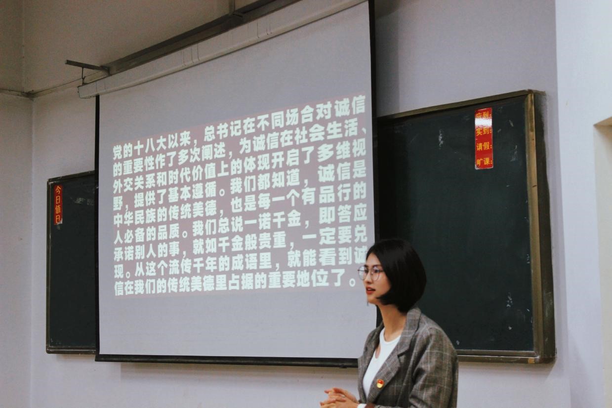 在此次团课中,苗老师主要就何为诚信、传统文化与诚信、思想道德与文化、铸魂育人四个方面进行讲解。在“何为诚信”模块中,苗老师分别分析“诚”与“信”,“诚”:内城于心;“信”:外信于人。诚与信的结合形成了内外兼备、具有丰富内涵的词汇。同时提到,诚信是社会主义核心价值观中的一个准则,是立世之根本,对于一个人而言,人无信不立,对国家而言,国无信不兴。在“传统文化与诚信”中讲到,诚信是我党强大的基础,是贯彻落实科学发展观的必然要求。所以,每个人在工作和生活中都要讲诚信,遵守社会公德。