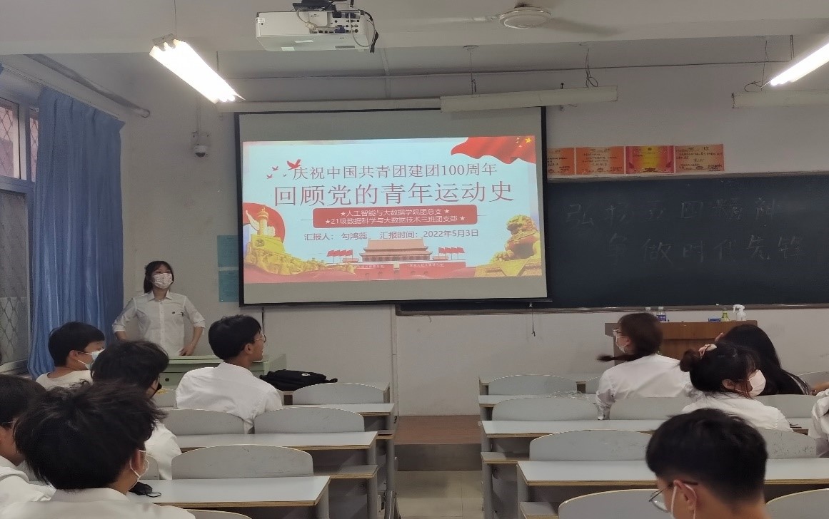 为了明确“喜迎二十大、永远跟党走、奋进新征程”的时代主题,教育引导广大团员青年学团史、强信念、践使命、跟党走,增强团员青年的光荣感和使命感,激发团员青年爱团爱党的热情,人工智能与大数据学院团总支于2022年5月3日晚上七点在各班自习室举办“回顾党的青年史”主题团课,本次班会由各班团支书主持。