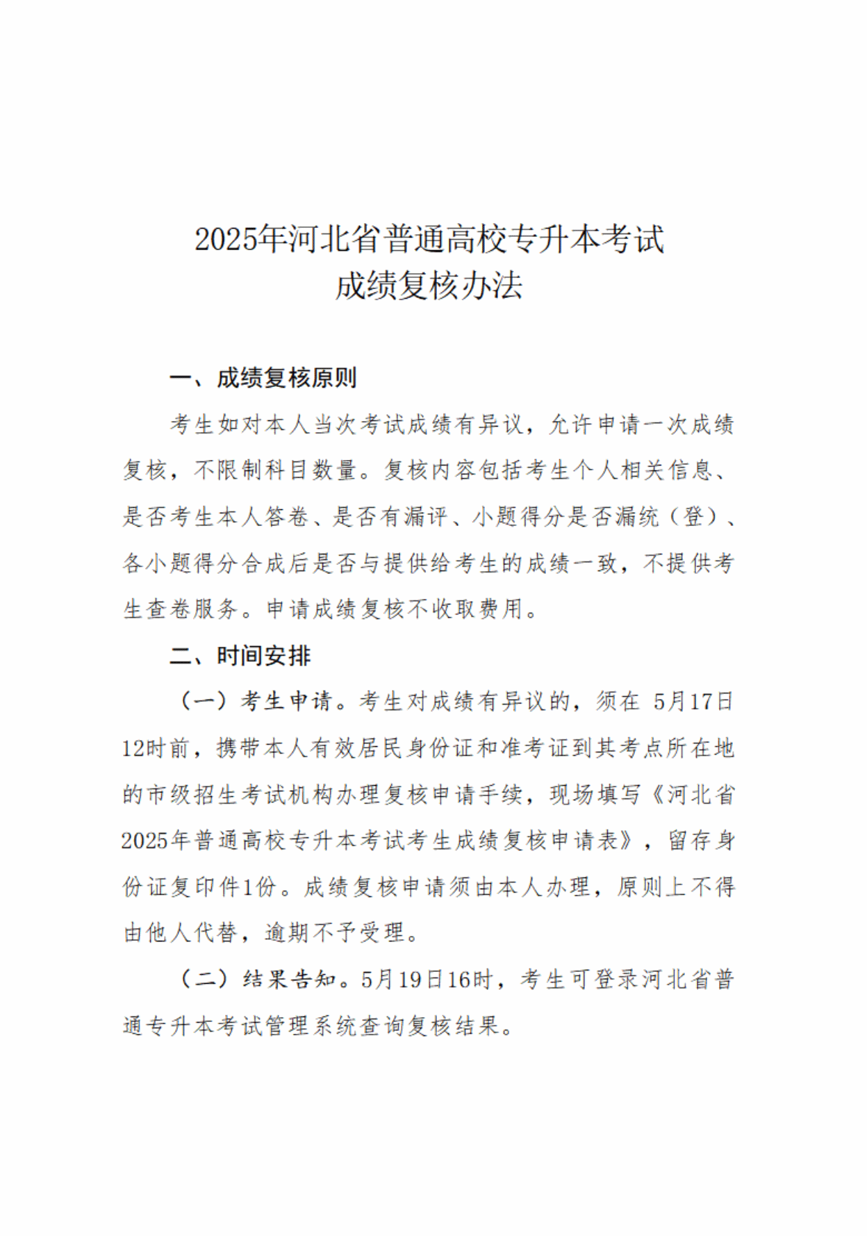 二、成绩复核。如考生对考试成绩有异议,请于 5月17日12时前申请复核;5月19日16时可登录河北省普通专升本考试管理系统查询复核结果。成绩复核办法见附件。
