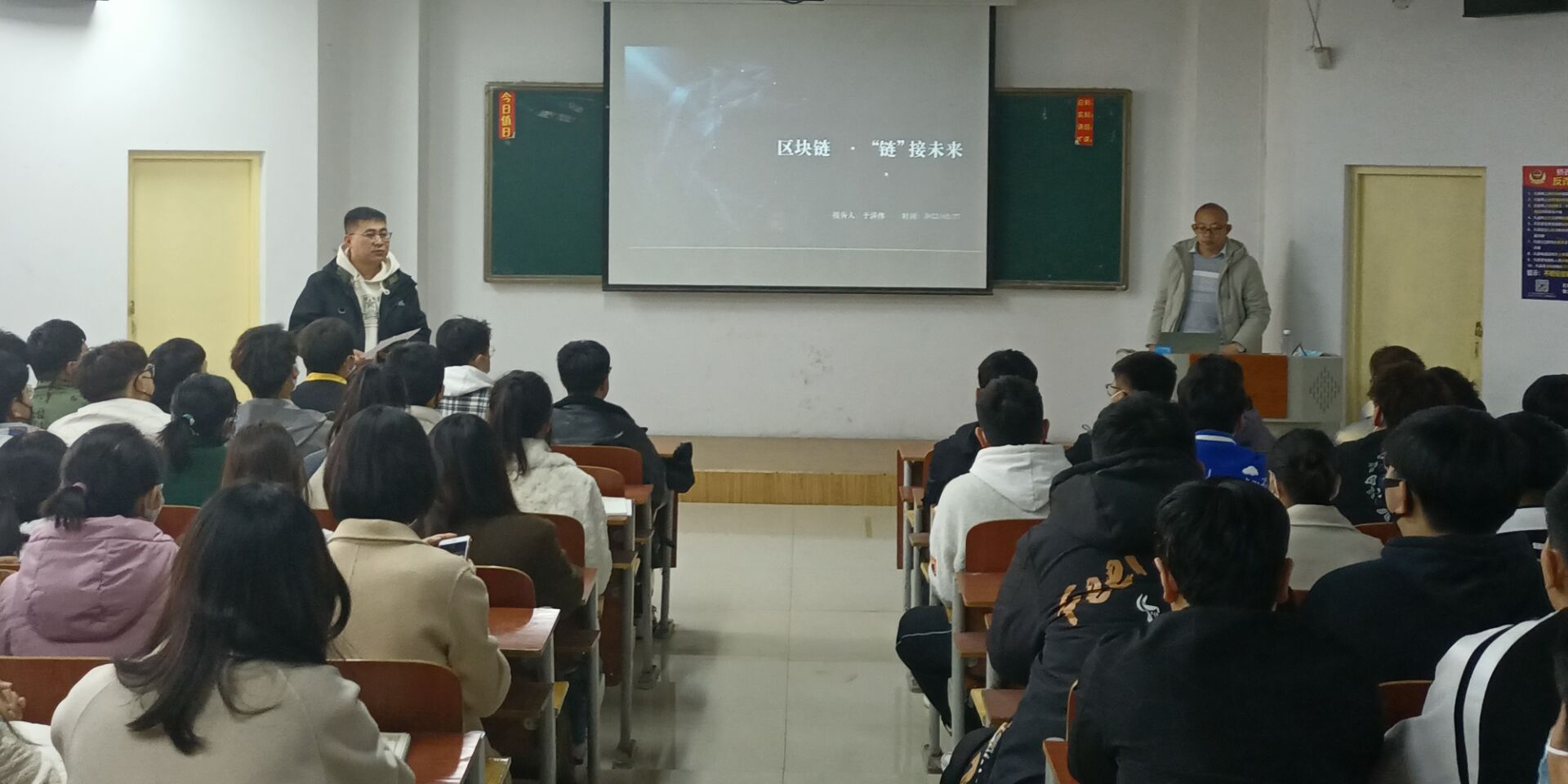 首先,由人工智能大数据学院学管副院长尹钧主持并介绍出席的老师与于洪伟总监。随后,于总监分享个人经历,结合自身的学习和工作经验从三个方面进行区块链相关讲解:1.针对区块链技术的分析。介绍区块链技术是利用块链式数据结构来验证与存储数据,利用分布节点共识算法来生成和更新数据、利用密码学的方式保证数据传输和访问的安全;2.讲解区块链核心技术的组成与发展动态。提出去中心化系统问题,从两方面对问题的形成原因和发展过程进行深入浅出的分析;3.解析区块链技术未来趋势。于总监指出,区块链技术与人工智能、大数据、物联网、边缘计算、云计算、5G等新一代信息技术类似,都是数字化信息系统的基础设施,若能促进各类技术之间的融合发展 ,可以更有效地促进数字经济与数字社会的发展。最后,于总监进行总结,区块链技术未来趋势有多种可能,对现场老师与学生,从理论学习和实践技能角度提出相应的指导与规划。