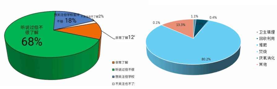 此次调研了解到当地共有1座生活垃圾填埋场、3个垃圾处理站、5个垃圾分类回收站,目前的生活垃圾运至生活垃圾卫生填埋场进行无害化处理;经过入户调查和问卷调查发现68%的村民和商家小贩对于垃圾分类处理工作听说过但不很了解,18%的村民表示接受过垃圾分类知识的宣传活动,但大多数都只停留在表面,并没有深入的去学习如何分类,12%的村民和商家小贩对于垃圾分类处理工作是非常了解,且大力支持此项国家政策,还有2%的村民既不关注也不了解。