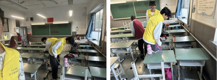 放学后,志愿者帮助孩子们收拾书包,整理教室