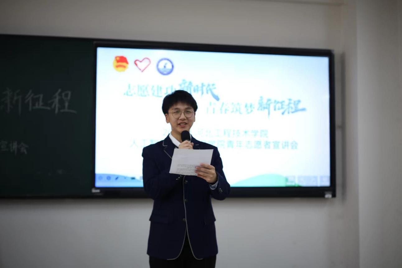 刘彬,曾组织2023年河北工程技术学院消防安全月系列活动,组织学院参加2024年石家庄文明实践我行动雷锋宣传日志愿服务活动;他本人参与过2023中国西部旅游产业博览会志愿服务活动,成渝青年模拟联合国大会志愿服务活动,中国国际智能产业博览会志愿服务活动,IDO动漫游戏嘉年华志愿活动,石家庄轨道交通集团消防救援支队组织的地铁站消防宣传活动等。主持人介绍完毕后,邀请刘彬同学上台进行了“青春当燃,志愿有我”的主题分享。