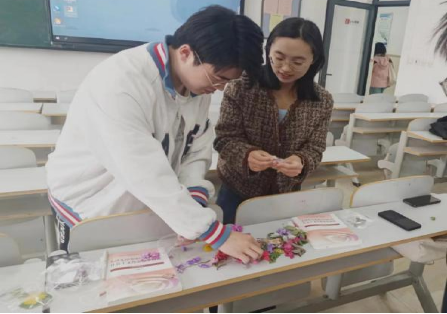 马克思主义学院教师路晓佳与班长毕荣鑫共同制作春花书签