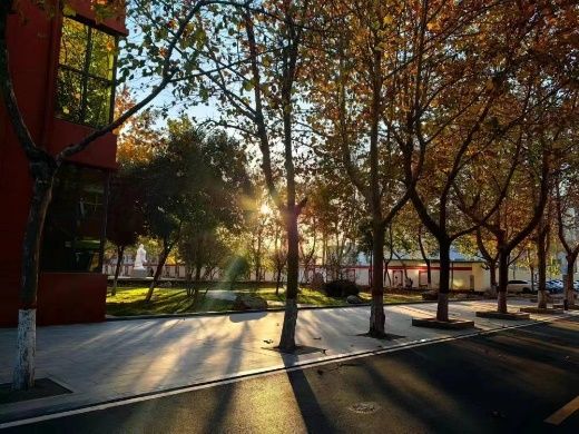 夕阳挥酒下金色的光辉,将整个校园披上一层华丽的盛装,校园内的建筑物呈现出一种更加壮丽的姿态。每一处景观都在夕阳的映衬下,流淌出温暖与宁静的气息,仿佛时间在这一刻定格,让这片美丽的角落永恒地存在于记忆之中。