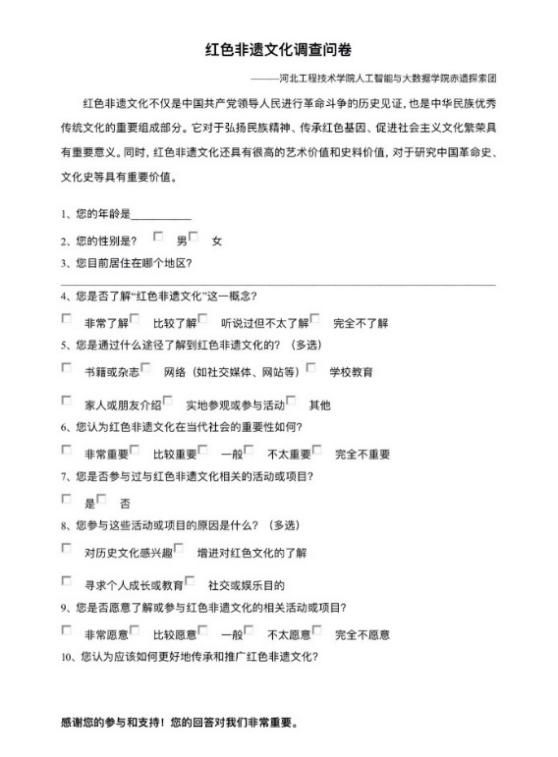 习近平总书记强调,“文化是一个国家、一个民族的灵魂。文化兴国运兴,文化强民族强。没有高度的文化自信,没有文化的繁荣兴盛,就没有中华民族伟大复兴。”为了传承历史文化的珍贵财富,河北工程技术学院赤遗探索团于7月1日准备开展暑期实践活动,探寻非遗文化的精髓。本次活动的主题是“探寻非遗之美,弘扬华夏之魂”,此次活动旨在传播和弘扬我国丰富多彩的非物质文化遗产,激发青年一代对非遗文化的热爱。通过这次调研学习,志愿者们深刻认识到文化传承的责任和使命,为推动中华优秀传统文化的传承发展贡献一份力量,让非遗文化在新时代焕发出新的生机与活力。