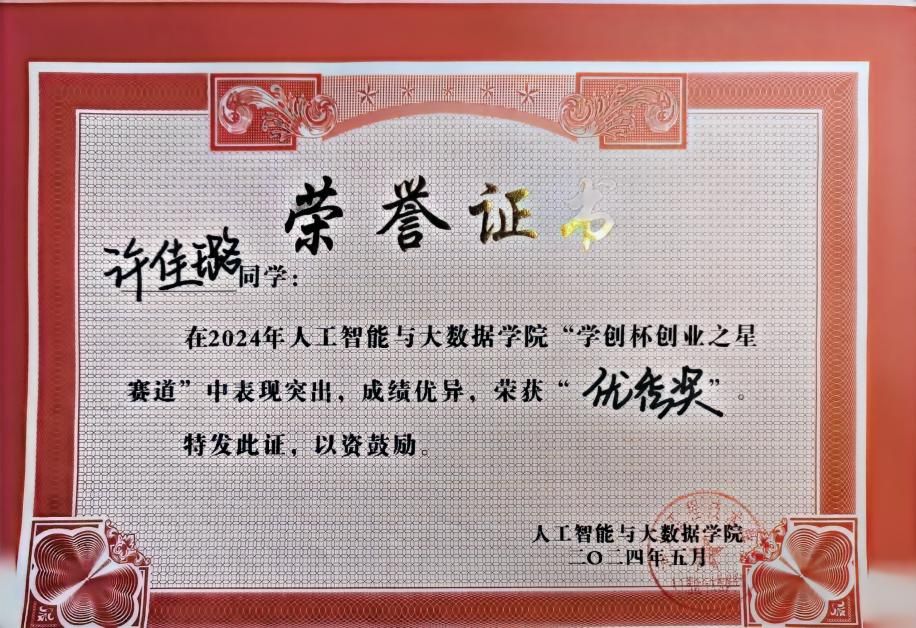 2024年荣获人工智能与大数据学院“学创杯创业之星赛道”中荣获“优秀奖”。