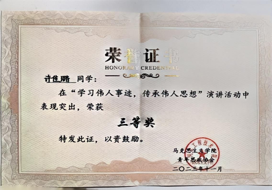 2023年“学习伟人事迹,传承伟人思想”演讲活动中荣获“三等奖”,“三好学生”称号。