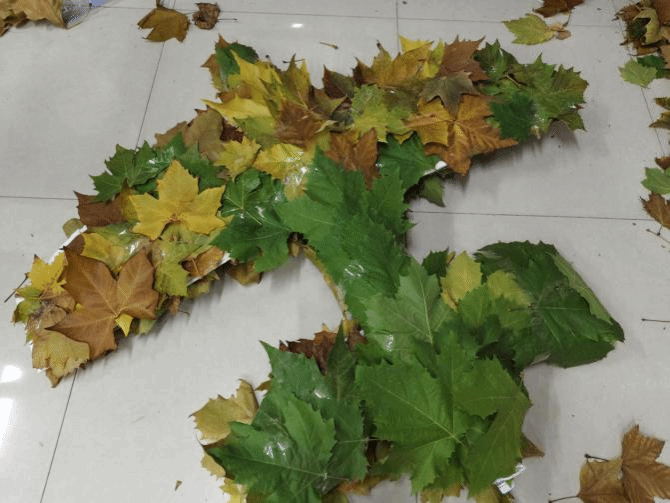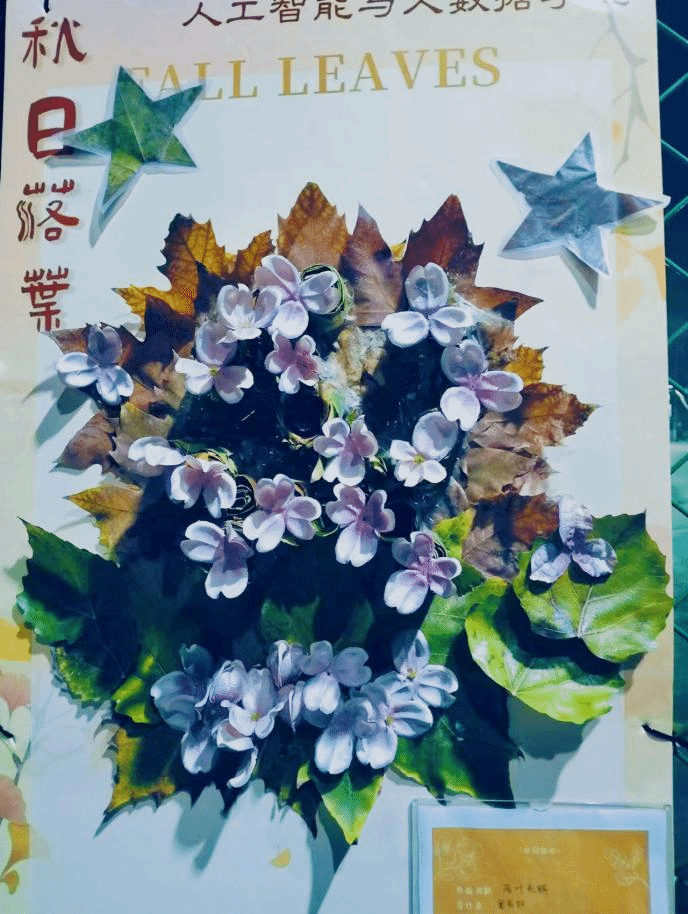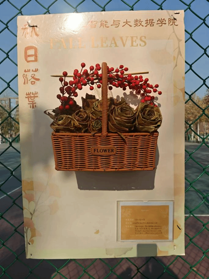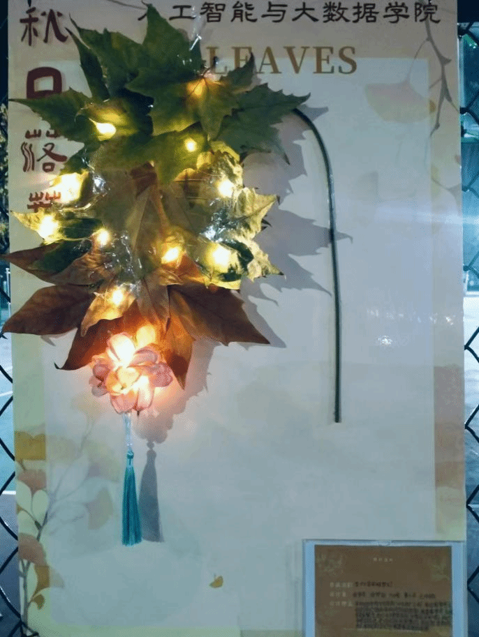 学生们发挥无尽创意,对落叶进行精心裁剪,巧妙拼凑制作出一幅幅精美的图案,展板右下标注了设计者的设计理念及作品名称。用落叶制作的花篮,散发着浓郁的田园气息与古朴韵味;发光的蝴蝶灯笼,宛如一群闪耀着奇异光芒的精灵在夜色中翩翩起舞;落叶版蒙娜丽莎,一片片耐心地拼凑出她那神秘而迷人的面容、优雅的身姿散发着古典艺术的庄重与深沉;一个福字传达出对幸福生活的向往、对美好未来的期盼;古风落叶琵琶的造型,仿佛能听到悠扬的古乐从历史的深处传来,令人沉醉在那源远流长的文化长河之中……