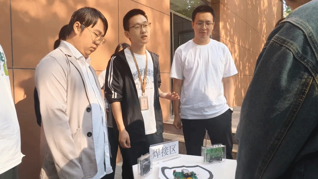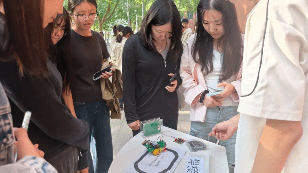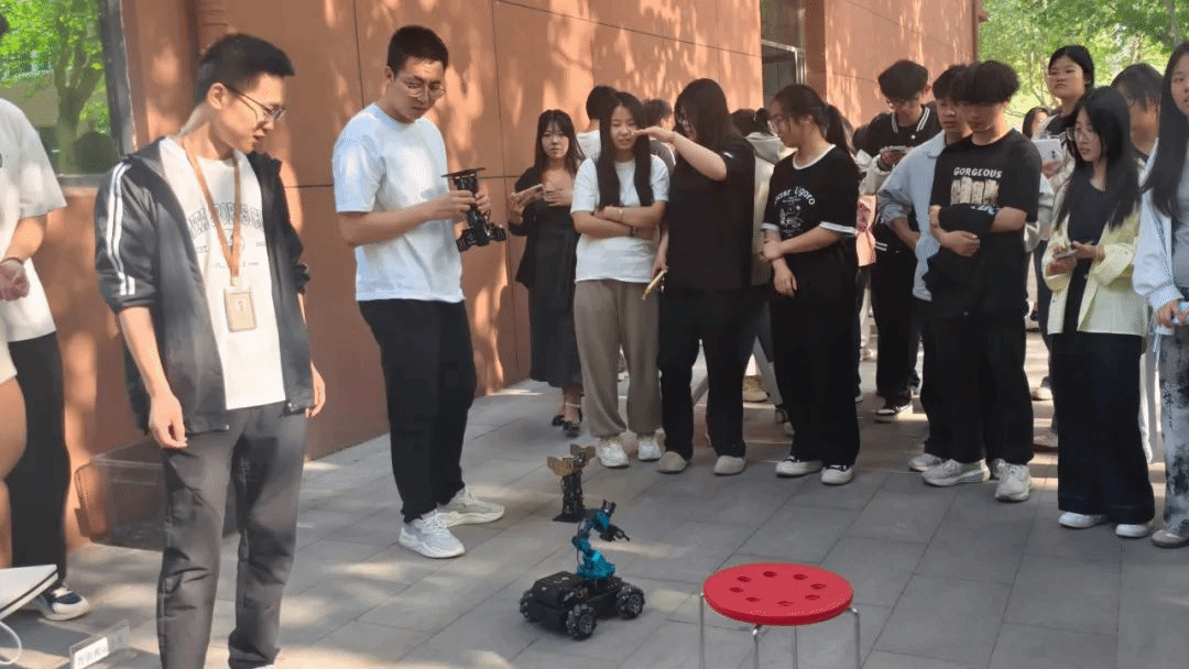活动现场展出多款智能机器人,涵盖基础型、服务型与互动型多个类别。工作人员引导学生们近距离观察每一款机器人的独特结构与电路设计,详细介绍其功能特点与应用场景。学生们纷纷拍照记录,不时围绕机器人展开热烈讨论,现场气氛活跃而热烈。