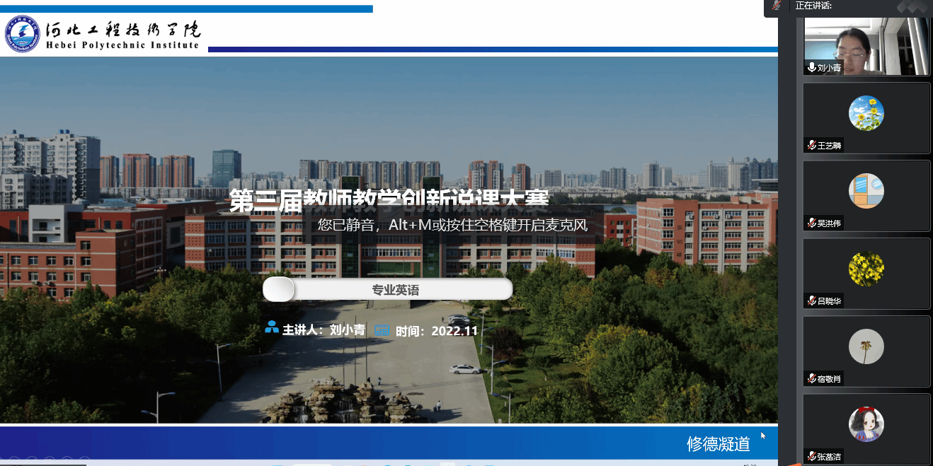 为提高教师教学水平,激发教学创新能力,全面提升课堂教学质量,智能科学与技术系于2022年11月25日晚上19:00开展“教学创新比赛”,本次竞赛诚邀各系部资深教师进行点评。本次比赛以线上腾讯会议的方式开展,我系赵程伟、孙维雅、刘小青、张菡洁、王艺暽、吴洪伟、刘青七位教师老师积极参赛此次比赛。